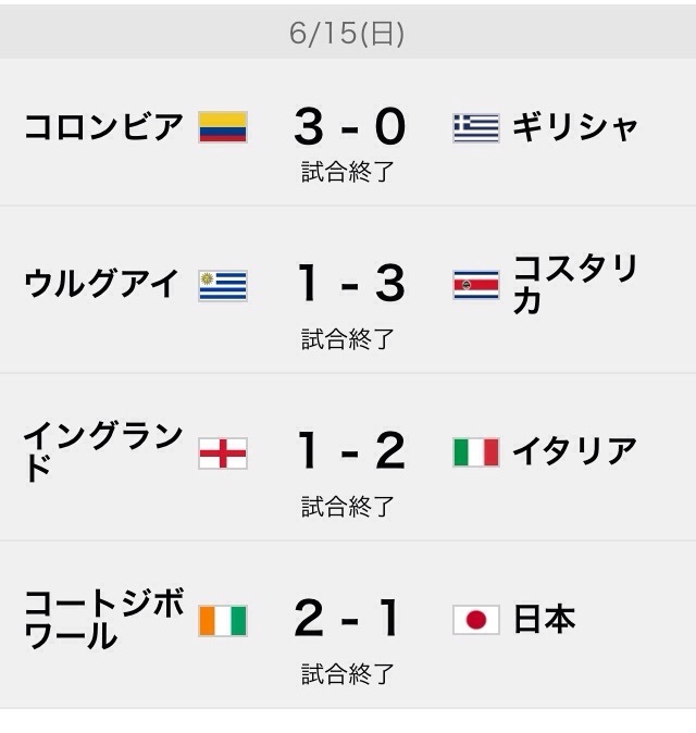 日本負けたね〜 ワールドカップ 2014年06月15日 あまり暑くない。最近、雨ほとんど降らないし、暑くないし、夏終わったの?w杯今日の結果日本vsコートジボワールがあったけど、いつもの日本って感じだった。同じC組の試合もあった、少し見てたけど、ギリシャ??? ギリシャってあんな感じだったかな〜?今日の組み合わせ PR