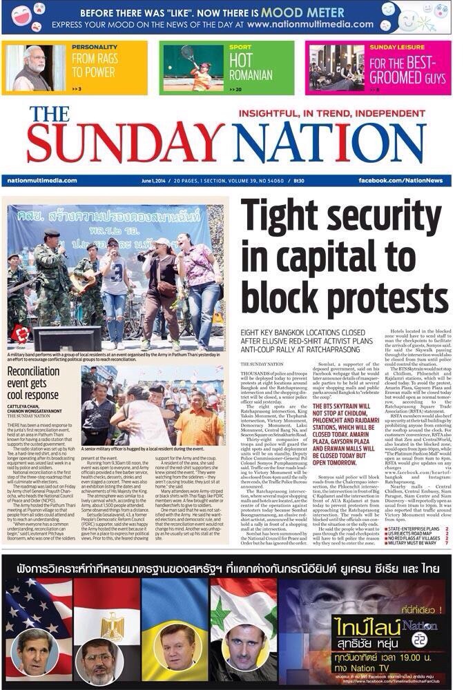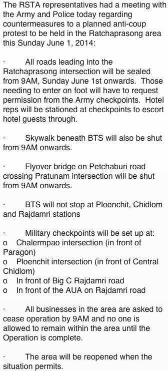 晴れの日曜日ーバンコク バンコク 2014年06月01日 今日は、いい天気です。 暑くなりそうです。 今日、午前9時からセントラルワールドの前のラチャプラソンエリア周辺が軍により封鎖される様です。チッドロム駅からサイアム駅に向かうスカイウォークも同じく9時から通れない様です。 にほんブログ村