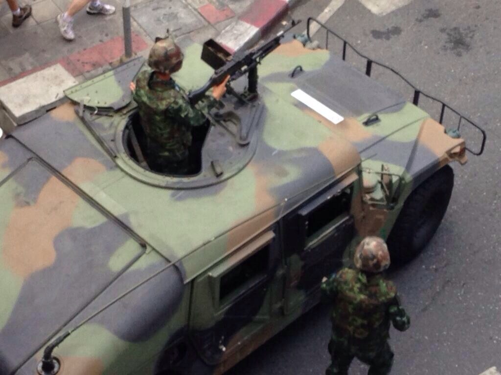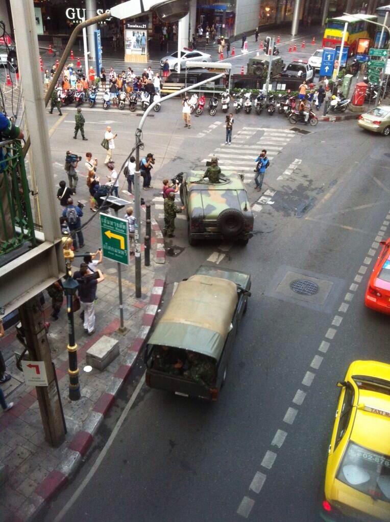 晴れーバンコク バンコク 2014年05月31日 今日は、いい天気です。 クーデター情報ですが、明日午前9時からセントラルワールドの前のラチャプラソンエリア周辺が軍により封鎖される様です。チッドロム駅からサイアム駅に向かうスカイウォークも同じく9時から通れない様です。 アヌサワリーで軍の車に落書きした女性が捕まったようです。 まだまだ、軍と反クーデターのグループの衝突などが予想されますので気をつけた方がいいですね。 にほんブログ村