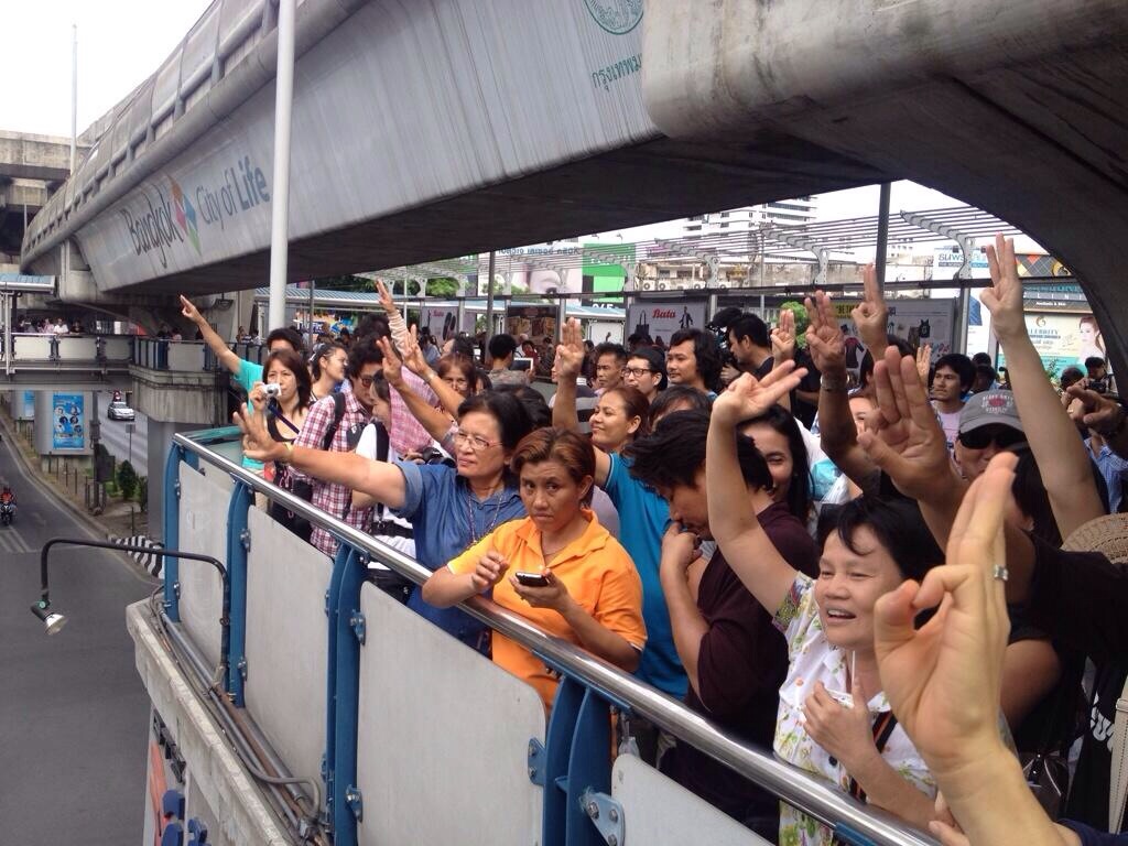 今週はどうなるのか? ー クーデター、バンコク バンコク 2014年06月02日 今日ねバンコクは、いい天気です。 昨日、日曜日の午後9時からセントラルワールド前のラチャプラソンを封鎖するとなってましたが、反クーデターのデモ隊が来ると予想して軍、警察をたくさん投入して準備していましたが、デモ隊が集中せず少人数が色々な所に居たようです。BTSアソーク、ターミナル21に集まって来た為に午後2時ごろ、急遽クローズになりました。 昨日から、指を3本立てたサインが登場しました。 今日、月曜日は今の所すべての駅は開いています。 セントラルワールド、ターミナル21も開いています。 反クーデターのデモ隊次第ですね。 どうなって行くのでしょうか? にほんブログ村 PR