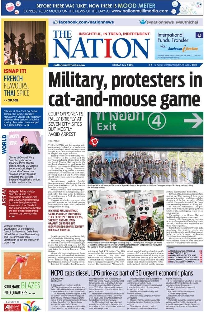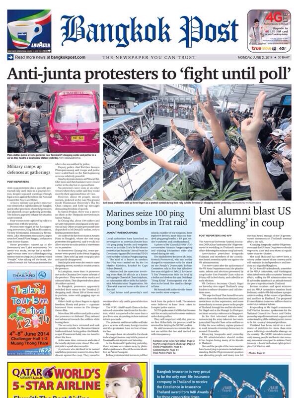 クーデター、バンコク バンコク 2014年05月30日 お早う御座います。今日は、快晴です。 昨日アヌサワリーで、メッセージの書いたTシャツを持っていたベルギー人が一時拘束されました。現在は、解放されてるみたいですが・・・デモ周辺には安全の為に近づかない方がいいと思います。 にほんブログ村
